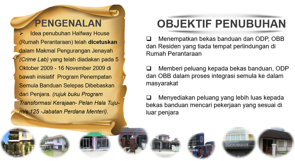 Rumah yang disediakan lengkap dengan kemudahan asas termasuk makan dan minum kepada ODP dan bekas banduan yang baru bebas dari penjara dan tiada tempat untuk tinggal kerana tiada keluarga atau keluarga enggan untuk menerima mereka kembali atau mereka yang secara sukarela untuk tinggal di situ. Bekas banduan akan tinggal selama tidak lebih 3 bulan.