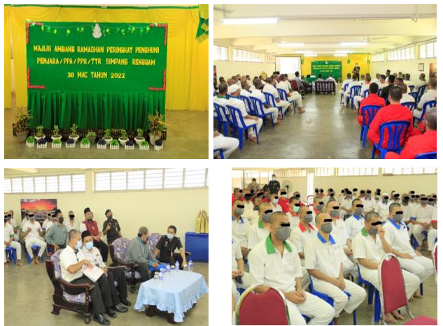 30 Mac 2022 (Rabu) 1000 Hrs | Bertempat di Dewan Seri Angsana, Penjara Simpang Renggam Johor telah diadakan Program Ambang Ramadhan Peringkat Penghuni Penjara Simpang Renggam anjuran Unit Agama bersama Yayasan Dakwah Islamiah (YADIM) Negeri Johor. Ceramah bertajuk : Menuju Ramadhan Persiapan Ilmu Dan Iman telah disampaikan oleh penceramah undangan Al-Fadhil Ustaz Muhammad Aliffudin Bin Ramlee dari Yayasan Dakwah Islamiah (YADIM) Negeri Johor. Antara pengisian ceramah yang telah disampaikan adalah berkaitan amalan-amalan sepanjang bulan Ramadhan antaranya : Persiapan diri menjalani bulan Ramadhan, amalan yang sesuai sepanjang bulan barakah dan maghfirah. Jumlah kehadiran seramai (100) orang Banduan dan tahanan penjara. Program tersebut disempurnakan oleh TPP Mohd Nur Azwan Bin Ab Rahman selaku wakil Pengarah dan diakhiri dengan penyampaian cenderahati oleh IP Mohamad Bin Hasan selaku Wakil Pengarah Penjara Simpang Renggam kepada penceramah undangan Al-Fadhil Ustaz Muhammad Aliffudin Bin Ramlee dari Yayasan Dakwah Islamiah (YADIM) Negeri Johor.