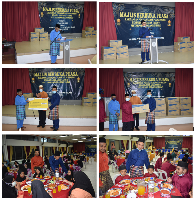 Pada 17 April 2022 (Ahad), Bertempat di Wisma Yatim Perempuan Islam Pulau Pinang telah diadakan Majlis Berbuka Puasa Kakitangan Penjara Reman Pulau Pinang bersama anak-anak yatim dan penyampaian sumbangan zakat. Penyampaian sumbangan zakat diserahkan oleh PKP Mohamad Jusoh Bin Ismail, Pengarah Penjara Reman Pulau Pinang kepada YBhg. Tan Sri Dato Seri (Dr.) Haji Mohd Yussof Latiff, Yang Di Pertua,Persekutuan Kebajikan Anak-Anak Yatim Islam Pulau Pinang. Antara tetamu jemputan pada majlis tersebut ialah PKK Zulkifli Bin Abdul Manah, Pengarah Penjara Negeri Pulau Pinang.