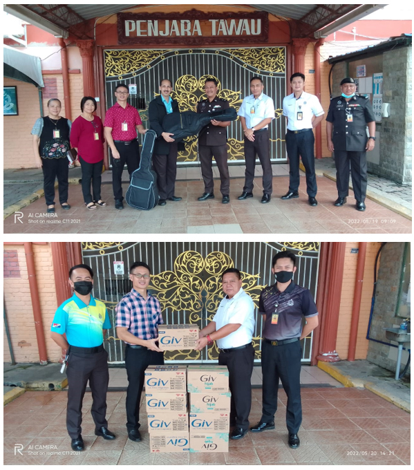 20 Mei 2022 (Jumaat) - PP Supian Bin Kamarudin, Timbalan Pengarah Penjara Tawau bersama TPP Shamsul Zuraimi Bin Mat Shah mewakili PKK Abd Rauf Bin Lang Pasih, Pengarah Penjara Tawau menerima sumbangan keperluan Penghuni ( 2 unit Gitar Yamaha & 1500 ketul Sabun Mandi ) daripada Edmund Kumar, Director of Prison Services Prison Fellowship Malaysia (Sabah) bersama Sabin Borog, Pengerusi Prison Fellowship Malaysia (Sabah) Tawau Chapter.