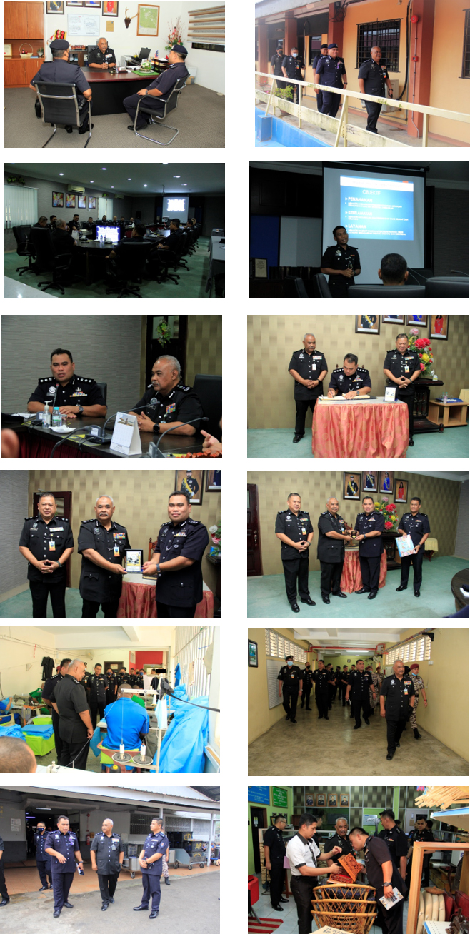 ISNIN, 05 September 2022 – YDH Pegawai Yang Menjaga Penjara Simpang Renggam, TKP Abdul Kadir Jailani Bin Ismail menerima kunjungan hormat daripada Ketua Polis Daerah Kluang, ACP Bahrin Bin Mohd Nor. Beliau yang turut disertai seramai 14 orang delegasi terdiri daripada ketua-ketua bahagian Ibu Pejabat Polis Daerah Kluang (IPD Kluang) tiba ke Penjara Simpang Renggam pada jam 09.00 pagi dengan disambut oleh Penguasa Penjara, PP Mohd Rehan Bin Hj Khamis di perkarangan bangunan pentadbiran. YDH ACP Bahrin Bin Mohd Nor bersama Timbalan Ketua Polis Daerah Kluang, DSP Abdul Razak Bin Abdullah Sani dibawa ke Bilik PYM untuk mengadakan pertemuan bersama Pegawai Yang Menjaga Penjara Simpang Renggam sebelum dibawa pula ke Bilik Mesyuarat untuk sesi taklimat yang disampaikan oleh TPP Mohd Hafizudin Bin Zainal Abidin dan sesi penyampaian cenderahati. ACP Bahrin bin Mohd Nor dalam ucapannya pada sesi taklimat menyatakan bahawa tujuan kunjungan hormat ini diadakan adalah untuk mengeratkan silaturrahim antara pihak IPD Kluang bersama Penjara Simpang Renggam selain berhasrat ingin menjalinkan kerjasama bagi program sukan dan kemasyarakatan pada masa akan datang.