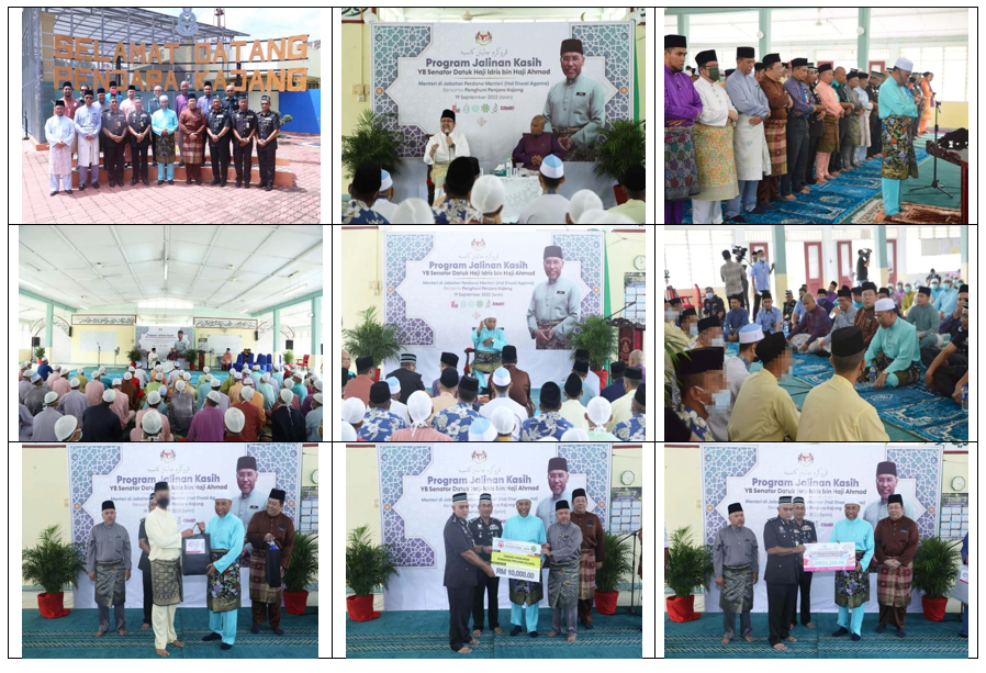 Program Jalinan Kasih Yang Berhormat Senator Datuk Haji Idris Bin Haji Ahmad Menteri Di Jabatan Perdana Menteri (Hal Ehwal Agama) Bersama Penghuni Penjara Kajang diadakan pada hari Isnin, 19 September 2022. Program bermula jam 12.00 tengahari sehingga 2.30 petang. Program dimulakan dengan ceramah agama yang disampaikan oleh Yang Berbahagia Ustaz Mohamad Zarifi Bin Mohamad Daud, Pegawai Khas di Pejabat Menteri Di Jabatan Perdana Menteri (Hal Ehwal Agama) dan Saudara Faizal Bin Ismail daripada Radio Zayan. Program diteruskan dengan solat Zohor berjemaah dan tazkirah yang dipimpin oleh Yang Berhormat Menteri serta penyampaian sumbangan kepada penghuni yang disumbangkan oleh Yayasan Pembangunan Ekonomi Islam Malaysia (YaPEIM), QSR Brands (M) Holdings Berhad dan Yayasan Taqwa, Majlis Agama Islam Wilayah Persekutuan. Seramai 100 orang banduan bersama dalam program ini.