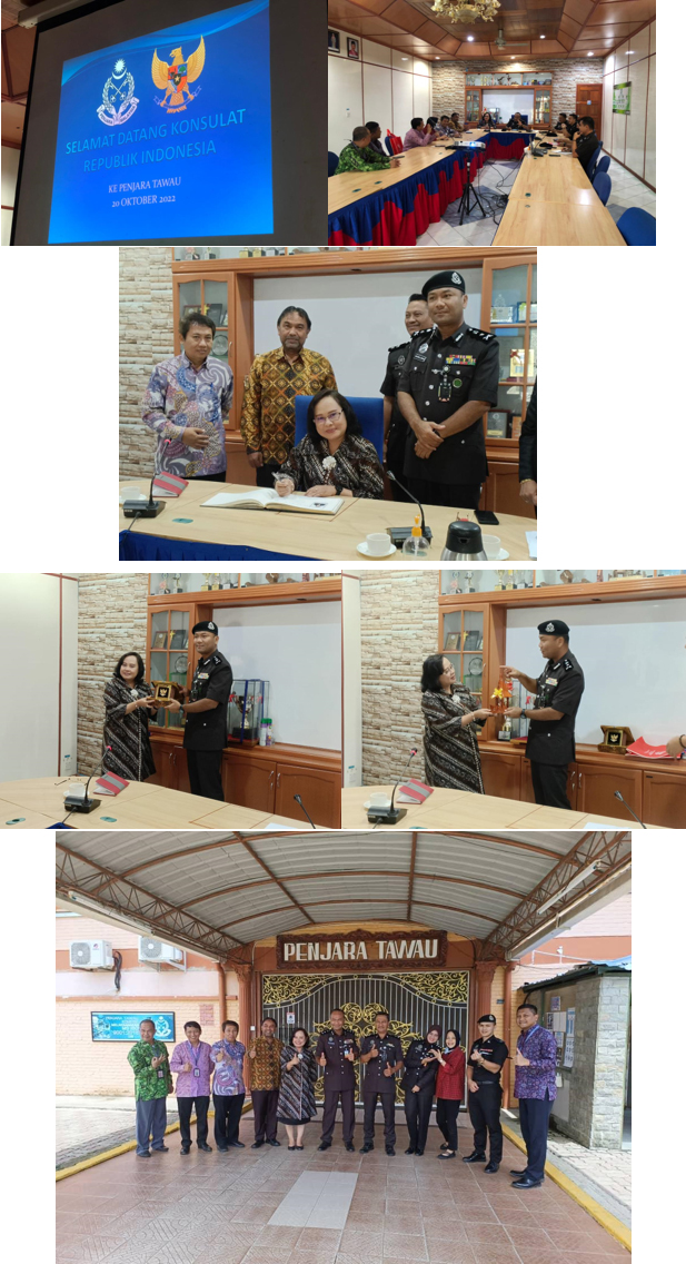20 Oktober 2022(Khamis) 10:00 pagi PKK KAMARUL ZAMAN BIN ALI ZAMAN, Pengarah Penjara Tawau diiringi oleh PP Supian Bin Kamarudin, Timbalan Pengarah Penjara Tawau telah menerima Kunjungan Kerja daripada Konsulat Republik Indonesia Tawau yang diketuai oleh Ibu Heni Hamidah, Konsul RI Tawau bersama 6 orang anggota KRI yang hadir. Kunjungan kerja ini bagi menzahirkan salam perkenalan dan membincangkan beberapa perkara berkenaan isu-isu semasa terutamanya yang melibatkan kerjasama antara pihak KRI Tawau bersama Penjara Tawau. Kunjungan hormat ini diakhiri dengan serah dan terima cenderahati.