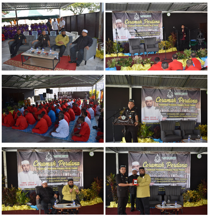 Pada 04 November 2022 (Jumaat), bertempat di Perkarangan Dewan Terbuka PPI, Penjara Pulau Pinang, pada jam 10.00 pagi telah diadakan Majlis Ceramah Perdana Peringkat Penghuni Penjara Pulau Pinang, dengan kupasan tajuk Di Sini Penjara, Di Sana Syurga. Antara yang hadir ialah PKP Mohamad Jusoh Bin Ismail, Pengarah Penjara Pulau Pinang, TPP Mahyuddin Bin Awang, anggota dan kakitangan. Penceramah jemputan pada majlis tersebut ialah YBhg. Ustaz Haslin Baharim dan YBhg. Ustaz Lutfi Amir Saidin. Cenderahati di sampaikan oleh PKP Mohamad Jusoh Bin Ismail, Pengarah Penjara Pulau Pinang kepada penceramah. Majlis berakhir dengan jamuan makan tengahari.