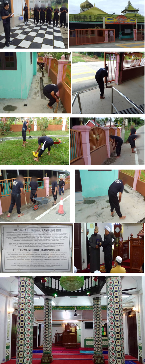 9 Disember 2022, seramai (10) Orang DiSelia (ODS) dan 6 kakitangan Pusat Koreksional Jasin, Melaka telah menjayakan Program Khidmat Komuniti dan Solat Jumaat di Masjid At-Taqwa Rim, Jasin. Program ini bermula pada jam 9.00 pagi dengan aktiviti gotong royong membersihkan kawasan dalaman dan persekitaran luar masjid bersama ahli jawatankuasa masjid dan penduduk setempat. Seterusnya ODS berkesempatan menunaikan Solat Jumaat bersama ahli qariah Rim. Pusat Koreksional Jasin, Melaka juga telah menerima cenderahati daripada Jawatankuasa Masjid sebagai tanda penghargaan di atas pelaksanaan program ini.