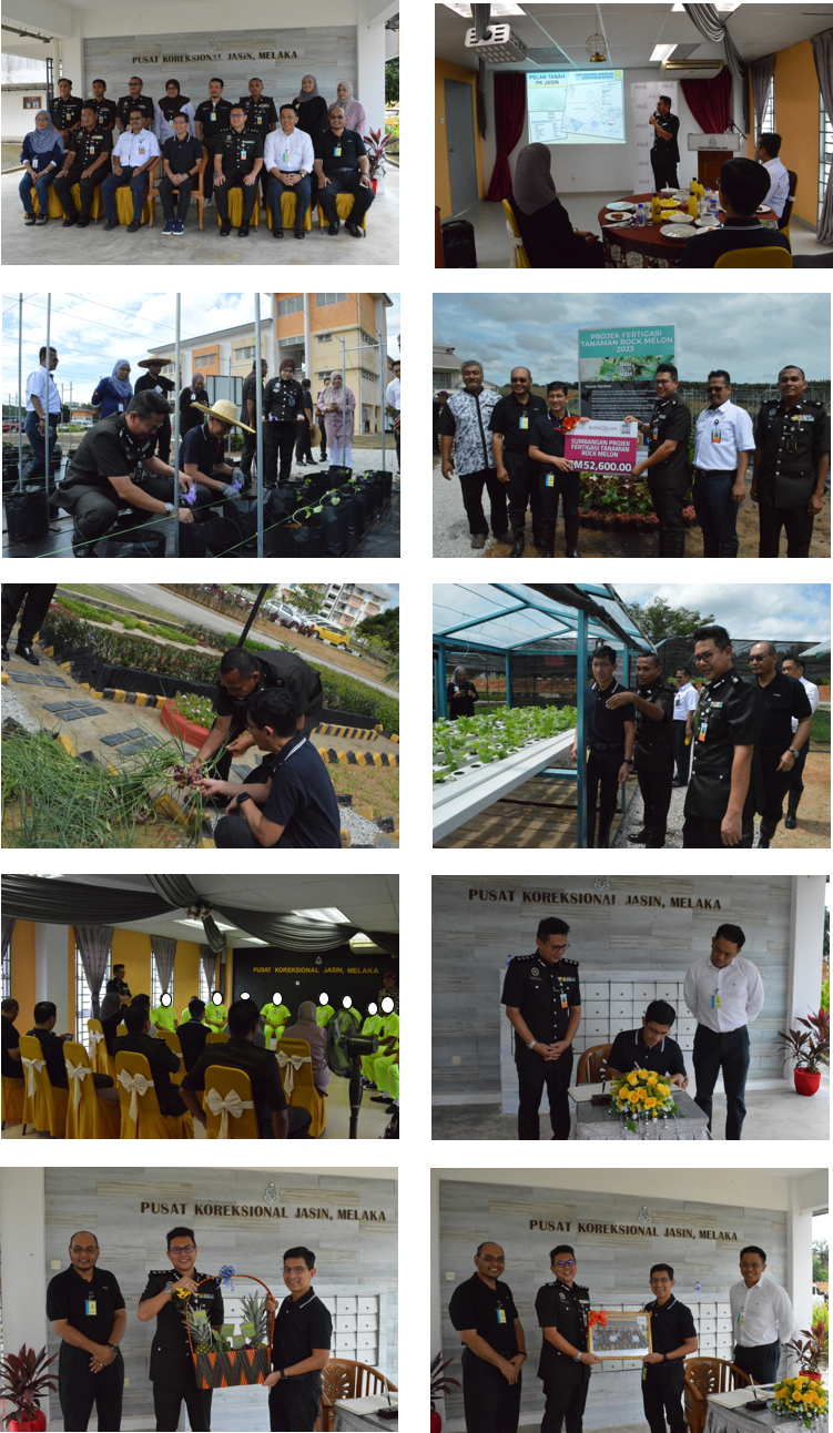 02 Mac 2023 (Khamis) Lawatan Ketua Pegawai Eksekutif Kumpulan Bank Islam Malaysia Berhad Encik Mohd Muazzam bin Mohamed bersama kumpulan Pegawai Kanan Bank Islam Malaysia ke Pusat Koreksional Jasin, Melaka. Lawatan tersebut disambut oleh PKP Mohd Idlan bin Jamil Pengarah Pusat Koreksional Jasin, Melaka bersama PP Mohd Suffian bin Said, Pegawai dari Seksyen Vokasional dan Industri IPPM dan Pegawai dari Pejabat Penjara Negeri Melaka. Lawatan dimulakan dengan taklimat oleh PKP Mohd Idlan bin Jamil berhubung operasi dan fungsi yang dilaksanakan oleh institusi ini. Aturcara lawatan utama adalah ke tapak Tanaman Fetegasi Rock Melon yang bertemakan “Amal Untuk Alam” dan simbolik penyerahan Replika Cek sumbangan oleh Bank Islam Malaysia berjumlah RM 52,600.00. Lawatan diteruskan ke kawasan tanaman lanskap sayur-sayuran secara hidroponik seperti timun jepun, sawi dan salad di (7) buah rumah hidroponik tersebut adalah hasil sumbangan daripada Bank Islam Malaysia. Lawatan diteruskan dengan sesi interaksi Orang DiSelia (ODS) bersama barisan Pegawai Kanan Bank Islam Malaysia yang bertujuan untuk memberikan input kepada pihak korporat bantuan-bantuan yang boleh diberikan. Lawatan diakhiri dengan menandatangani Buku Pelawat dan penyerahan cenderahati kepada Encik Mohd Muazzam bin Mohamed.