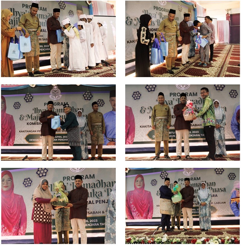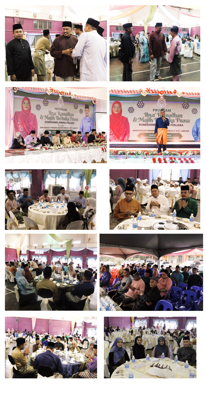 RABU, 08 April 2023 – Berlangsungnya program Ihya’ Ramadhan dan Majlis Berbuka Puasa Peringkat Penjara Negeri Sabah & W.P Labuan yang dikelolakan oleh Institusi Penjara Tawau yang bertempat di Dewan Wawasan, Taman Ehsan. Majlis disempurnakan oleh YBhg Dato’ Haji Nordin Bin Muhamad, Komisioner Jeneral Penjara diiringi oleh Pengarah Penjara Negeri Sabah & W.P Labuan YDH TKP Hajah Nora binti Musa. Hadir bersama Timbahan Pengarah Penjara Negeri Sabah PKK Abdul Rauf Bin Lang Pasih dan semua Ketua-ketua Institusi Penjara Sabah.