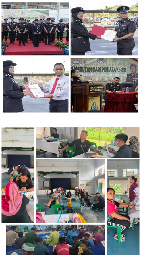 Bertempat di Penjara Pusat Kota Kinabalu diadakan Sambutan Hari Penjara Ke-233 bertema "Reformasi Kearah Pusat Pembangunan Peradapan Budaya kemanusian". Tentatif dimulakan dengan Perhimpunan Peringkat Institusi. Majlis ini telah dihadiri 120 orang pegawai, anggota dan kakitangan awam, Perbarisan ini diketuai oleh TPP Marcellimus Thom Benjamin. Majlis Sambutan Hari Penjara ke-233 peringkat Penjara Pusat Kota Kinabalu di Rasmikan Oleh TKP Hjh Nora binti Musa Pengarah Penjara Negeri Sabah & WP Labuan. Turut Hadir PKK Abd Rauf bin Lang Pasih Timbalan Pengarah Penjara Negeri Sabah & WP Labuan, PKK Teyun Thian Eim Pengarah Penjara Pusat Kota Kinabalu, PKP Kasumawati binti Illas, pegawai-pegawai Kanan dan kakitangan Penjara Pusat Kota Kinabalu. Majlis Perhimpunan dimulakan dengan nyanyian Lagu Negaraku, Sabah Tanah Air ku dan Bakti Setia. Majlis diteruskan dengan upacara penyampaian Sijil Penghargaan kepada 7 org kakitangan yang terdiri dari pegawai kanan dan lain-lain pangkat. Majlis diteruskan lagi dengan penyampaian Sumbangan Derma Khairat kepada Balu kepada Arwah Sjn 19228 Mohd Ardlin bin Abd Majid yang telah meninggal dunia pada 12 Feb 2023. Majlis diteruskan lagi dengan Penyampaian Amanat Dato' KJP Sempena Sambutan Hari Penjara ke-233. Majlis Perhimpunan diakhiri dengan sesi bergambar. Diantara program yang di jalankan sempena Sambutan Hari Penjara Ke-233 Peringkat Penjara Pusat Kota Kinabalu adalah Program Ceramah intergriti & Motivasi dari Puan Aini binti Awang daripada Jabatan SPRM, Program Derma Darah dan Pemeriksaan Kesihatan dengan kerjasama HQE2 dan Tabung Darah Negara Sabah, Gotong Royong Perdana dan Bacaan Doa Selamat di Surau Kuarters Taman Mat Salleh.