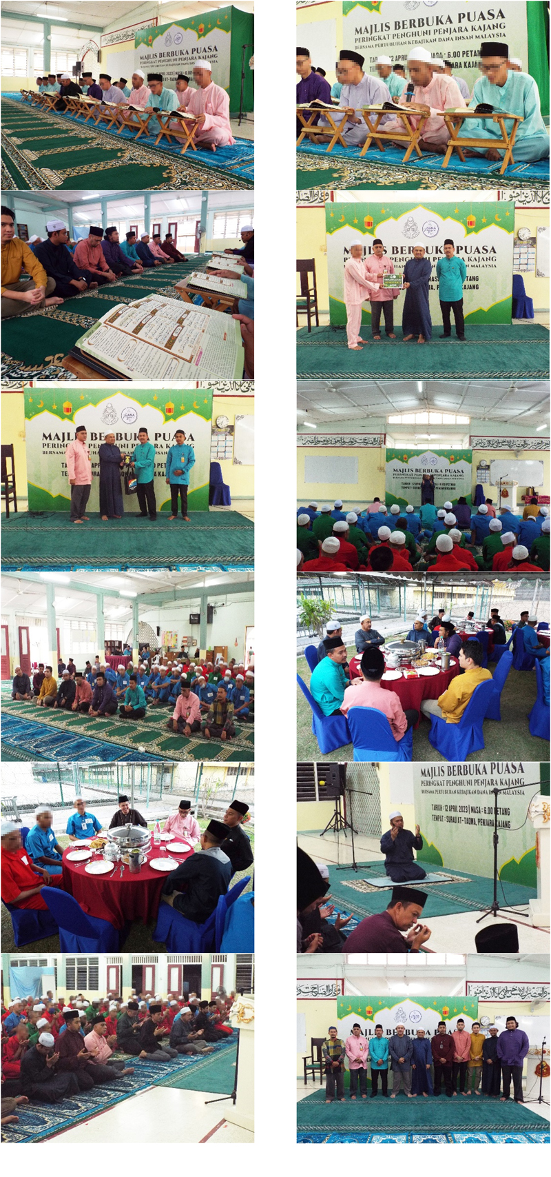 Rabu, 12 April 2023 telah diadakan Majlis Berbuka Puasa Peringkat Penghuni Penjara Kajang Bersama Pertubuhan Kebajikan Dana Insan Malaysia bermula jam 6.00 petang. Majlis dimulakan dengan majlis khatam al-Quran yang dipimpin oleh SJN Muhammad Hafis Bin Mohamad Foizi. Majlis diteruskan dengan penyampaian sumbangan dan cenderahati yang disempurnakan oleh PKK Tuan Kamarulzaman Bin Ismail, Timbalan Pengarah Penjara Negeri Selangor & W.P Kuala Lumpur, PKK Tuan Preshahdin Bin Monshee, Timbalan Pengarah Penjara Kajang dan Tuan Haji Ahmad Shukri Yusoff, Pengerusi Pertubuhan Kebajikan Dana Insan Malaysia. Majlis diteruskan lagi dengan takzirah penghayatan Ramadhan, majlis berbuka puasa dan solat Maghrib berjemaah. Hadir sama dalam program ini TKP Tuan Mohd Roslen Bin Ramli, Pengarah Penjara Kajang. Seramai 200 orang banduan bersama dalam program ini.