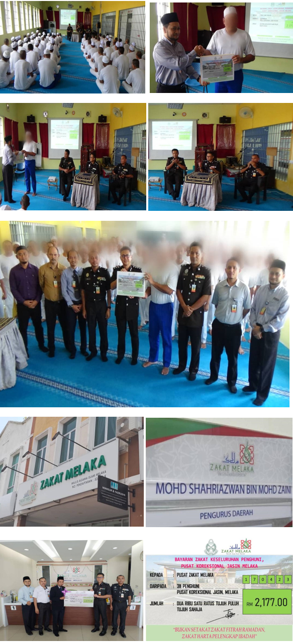 17 April 2023 bersamaan 26 Ramadan 1444H (Isnin), bertempat di Surau Al-Hidayah, Pusat Koreksional Jasin, Melaka telah berlangsung Majlis Pembayaran Zakat Fitrah Peringkat Penghuni bagi tahun 1444H/2023M. Status penghuni penjara tidak menghalang mereka untuk menunaikan tanggungjawab Rukun Islam yang ke-4 ini. Seramai (311) Orang DiSelia (ODS) telah membayar zakat fitrah pada tahun ini berjumlah RM7.00 setiap orang yang membawa jumlah keseluruhan sebanyak RM2,177.00. Sesi pembayaran Zakat Fitrah tersebut telah disaksikan oleh PKP Mohd Idlan bin Jamil, Pengarah Pusat Koreksional Jasin Melaka, PP Mohd Suffian bin Md Said, Timbalan Pengarah dan TPP Aswari bin Che Ibrahim, Ketua Bahagian Pengurusan Banduan Pusat Koreksional Jasin Melaka dan disempurnakan oleh wakil Amil Pusat Zakat Melaka, Ustaz Abdul Lathif bin Ismail, Ketua Unit Agama Pusat Koreksional Jasin. Bayaran Zakat Fitrah tersebut telah diserahkan kepada Pengurus Pusat Zakat Melaka daerah Jasin En Mohd Shahriazwan bin Mohd Zaini.