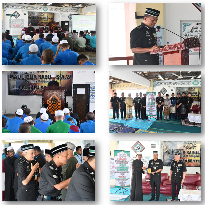 23 Jun 2023, Telah diadakan Perasmian Surau Jumaat Surau Al-Mujahirin (Penghuni) Kompleks Penjara Bentong. Surau Al Muhajirin merupakan surau yang telah dibina untuk penghuni- penghuni lelaki di Penjara Bentong bagi melaksanakan ibadah solat secara berjemaah disamping pelbagai aktiviti keagamaan yang turut dianjurkan di surau berkenaan. Dengan sambutan yang sangat baik dan memuaskan daripada para penghuni, surau ini telah diangkat sebagai satu tempat untuk penghuni- penghuni melaksanakan solat Jumaat dengan mendapat kelulusan daripada Majlis Ugama Islam dan Adat Resam Melayu Pahang. Majlis Perasmian Surau Jumaat ini telah dirasmikan oleh Timbalan Qadhi Daerah Bentong Pahang Ustaz Muhammad Luqman Bin Yahaya. Turut hadir TKP Dato’ Abu Hassan Bin Hussain Pengarah Penjara Negeri Pahang,TKP Mohamad Bin Ismail Pengarah Penjara Bentong dan Ustaz Syed Nasrullah Bin Syed Hamid Wakil dari Bahagian Agama & Kaunseling Ibu Pejabat Penjara Malaysia.