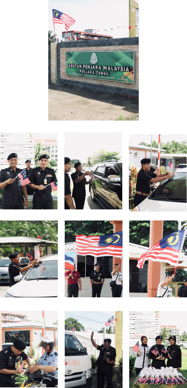 03|08|2023 @ Khamis, Kempen kibarkan jalur gemilang telah dijalankan di peringkat Penjara Tawau sempena sambutan bulan kemerdekaan yang ke 66 tahun. Gimik Penyerahan Bendera kepada kakitangan Penjara Tawau telah disempurnakan oleh Ydh. PP Supian Bin Kamarudin Timbalan Pengarah Penjara Tawau dan dibantu oleh PP Shamsul Zuraimi Bin Mat Shah, Bahagian Keselamatan Penjara Tawau. Semoga dengan adanya aktiviti seperti ini dapatlah menyemarakkan lagi sambutan bulan kemerdekaan dan semangat patriotik dikalangan kakitangan khasnya.