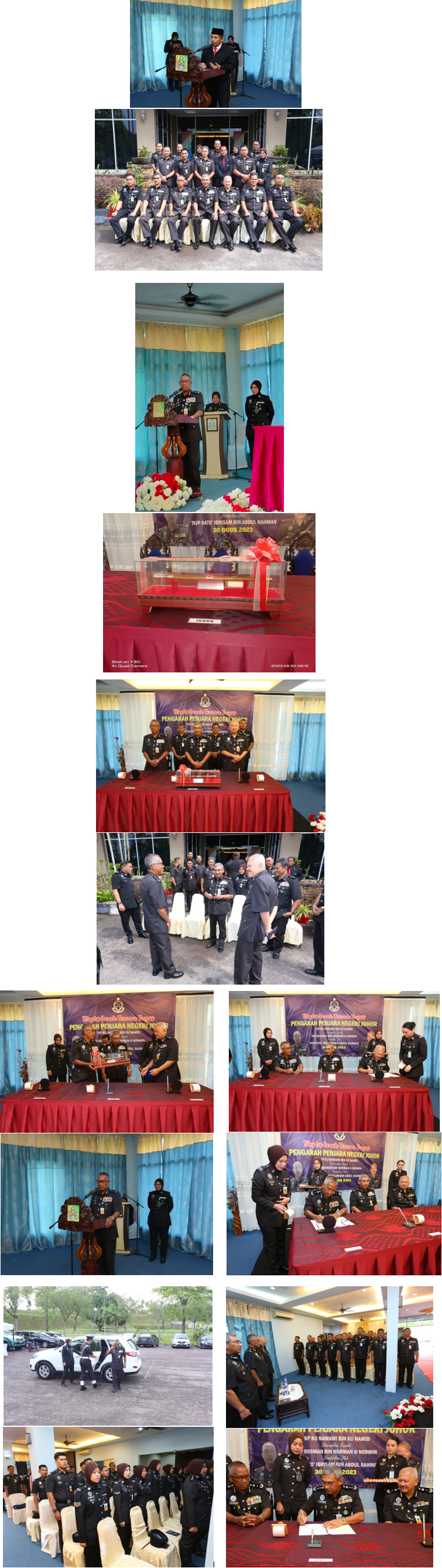 Majlis dimulai dengan menandatangani dokumen serah terima tugas Pengarah Penjara Negeri Johor diantara TKP Ku Nawawi bin Ku Hamid dengan TKP Rosman bin Norman@Normin dan disaksikan oleh TKJP Dato’ Ibrisham bin Abdul Rahman, Timbalan Komisioner Jeneral Penjara (Pemasyarakatan), Ibu Pejabat Penjara Malaysia dan telah berlangsung acara penyerahan membawa masuk tongkat kuasa.