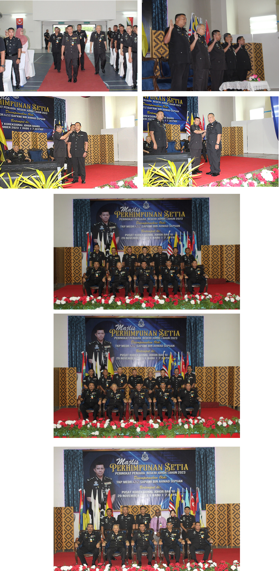 Seramai kira-kira (30) pegawai kanan, (20) kakitangan awam, dan (80) anggota lain-lain pangkat hadir dalam majlis perhimpunan tersebut. Perhimpunan dimulakan dengan nyanyian Lagu Bangsa Johor, Negaraku dan Bakti Setia serta lafaz ikrar. Majlis kemudian diteruskan dengan pemakaian pangkat kepada (34) pegawai kanan dan anggota serta penganugerahan pingat-pingat Jabatan Penjara Malaysia 2023 kepada (33) orang pegawai dan anggota. Majlis diakhiri dengan sesi bergambar kakitangan Penjara Negeri Johor bersama Pengarah Penjara Negeri Johor.