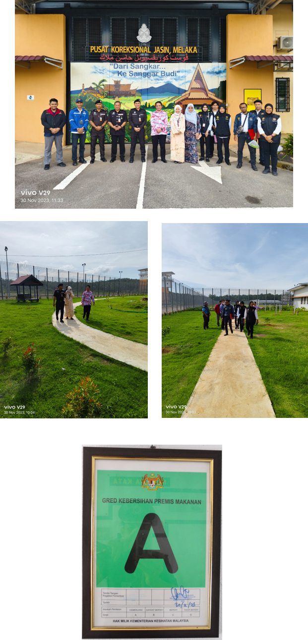 30 November 2023 (Khamis), Pusat Koreksional Jasin, Melaka telah menerima lawatan daripada pihak Pejabat Kesihatan Daerah Jasin, Melaka bagi Penilaian Kesihatan Persekitaran untuk kali yang kedua bagi tahun 2023. Pihak PKD Jasin diwakili Pakar Kesihatan Awam, Dr. Nur Shazlin binti Umar, Pegawai Perubatan, Dr. Nur Adawiyah binti Abd Jalil dan Dr. Mohd Nizam bin Mohd Yazid, bersama-sama Penolong Pegawai Kesihatan Persekitaran, Pn. Zuraiyah binti Kasah, En. Hellmy Shah bin Tugiman dan (06) lagi penolong pegawai kesihatan telah dibawa untuk membuat (05) skop pemeriksaan penilaian kesihatan persekitaran di Bengkel Dapur, Kantin Kakitangan, Blok Penempatan, Persekitaran Luar dan Persekitaran Dalam. Secara keseluruhan, pemeriksaan mendapati persekitaran institusi ini berada dalam keadaan yang baik dan bersih namun beberapa aspek keselamatan pekerjaan perlu dipertingkatkan. Penilaian Kesihatan Persekitaran dari Unit Keselamatan dan Kualiti Makanan PKD Jasin juga mendapati Bengkel Dapur dan Kantin Kakitangan institusi berada dalam keadaan yang sangat baik dan sekali lagi mengekalkan Gred A bagi Gred Kebersihan Premis Makanan untuk kedua-dua lokaliti premis makanan.