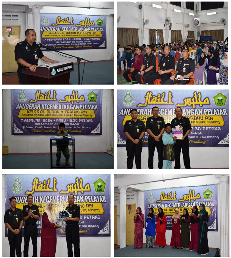 7 FEBRUARI 2024 | RABU, Majlis Ihtifal Hari Anugerah Kecemerlangan Pelajar Kelas Al-Quran dan Fardhu Ain Sekolah Agama KAFA Penjara Reman Pulau Pinang telah berlangsung dengan jayanya di Dewan Kelab Sukan, Penjara Reman Pulau Pinang. Majlis dimulai dengan bacaan doa, alunan bacaan al-Quran oleh Mohd Saifullah bin Ahmad Syahrin (Pelajar Tahun 5), persembahan nasyid oleh Pelajar Tahun 5 (Perempuan) dan ucapan aluan oleh PP Mohammad Safwan bin Sizali, Timbalan Pengarah Penjara Reman Pulau Pinang. Seterusnya, majlis diikuti dengan persembahan nasyid oleh Pelajar Pra KAFA, penyampaian hadiah kepada pelajar cemerlang setiap tahun dan subjek matapelajaran, cabutan bertuah dan persembahan nasyid oleh Pelajar Tahun 5 (Lelaki). PP Mohammad Safwan bin Sizali, Timbalan Pengarah Penjara Reman Pulau Pinang, hadir mewakili YDH PKP Ahmad Kamarrudin bin Ahmad, Pengarah Penjara Reman Pulau Pinang. Turut hadir TPP Awang Azizzan bin Hasbi dan TPP Teuku Mohd Hasbi bin Tarmizi menyempurnakan majlis penyampaian hadiah dan sesi cabutan bertuah. Majlis diakhiri dengan jamuan makan.