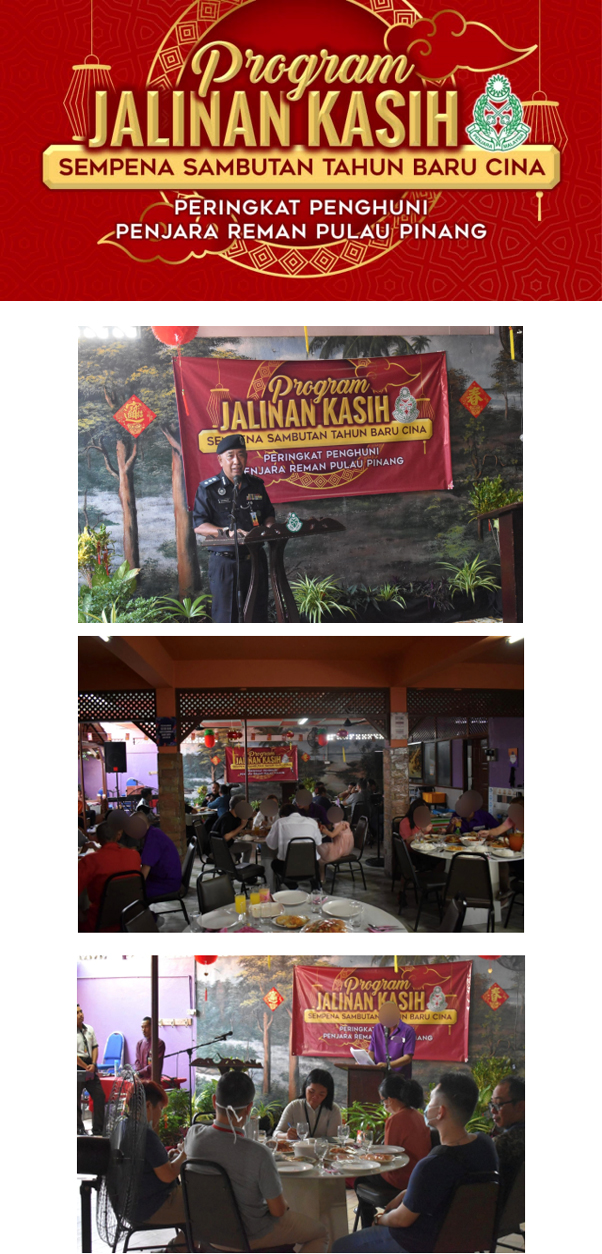 Pada 21 Februari 2024 (Rabu), bertempat di Kantin Pegawai Penjara Reman Pulau Pinang telah diadakan Program Jalinan Kasih Sempena Sambutan Tahun Baru Cina Peringkat Penghuni Penjara Reman Pulau Pinang Tahun 2024 anjuran Unit Pemulihan Penjara Reman Pulau Pinang. Program tersebut dirasmikan oleh PKP Ahmad Kamarrudin Bin Yaacob, Pengarah Penjara Reman Pulau Pinang. Seramai (11) orang ahli keluarga penghuni yang dijemput hadir dan (07) wartawan telah hadir memeriahkan program tersebut.