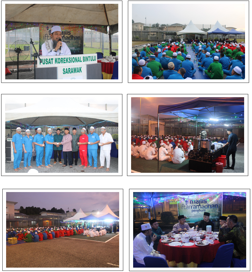 Pada 26 Mac 2024 (Selasa), telah diadakan Majlis Iftar Ramadan Banduan dan Tahanan bersama Pengarah Pusat Koreksional Bintulu/ PPK/ PPA bertempat di Perkarangan Padang Dalam. Majlis ini merupakan program anjuran Unit Program Pembangunan Insan (PPI) institusi pada setiap tahun bagi menghayati pengertian dan ibrah bulan Ramadan disamping merapatkan ukhwah dan silaturrahim dalam kalangan banduan dan tahanan. Seramai 150 orang banduan dan tahanan muslim telah terlibat pada kali ini. Antara pengisian majlis adalah ceramah agama disampaikan oleh Ustaz Saiful Bahri bin Soro, sesi penyerahan bubur lambuk oleh Pengarah Pusat Koreksional Bintulu/ PPK/ PPA, PKP Zakaria bin Mat Jusoh kepada banduan dan tahanan serta bacaan ayat suci Al-Quran oleh wakil banduan. Majlis bermula pada jam 5.30 petang dan berakhir pada jam 7.30 petang.