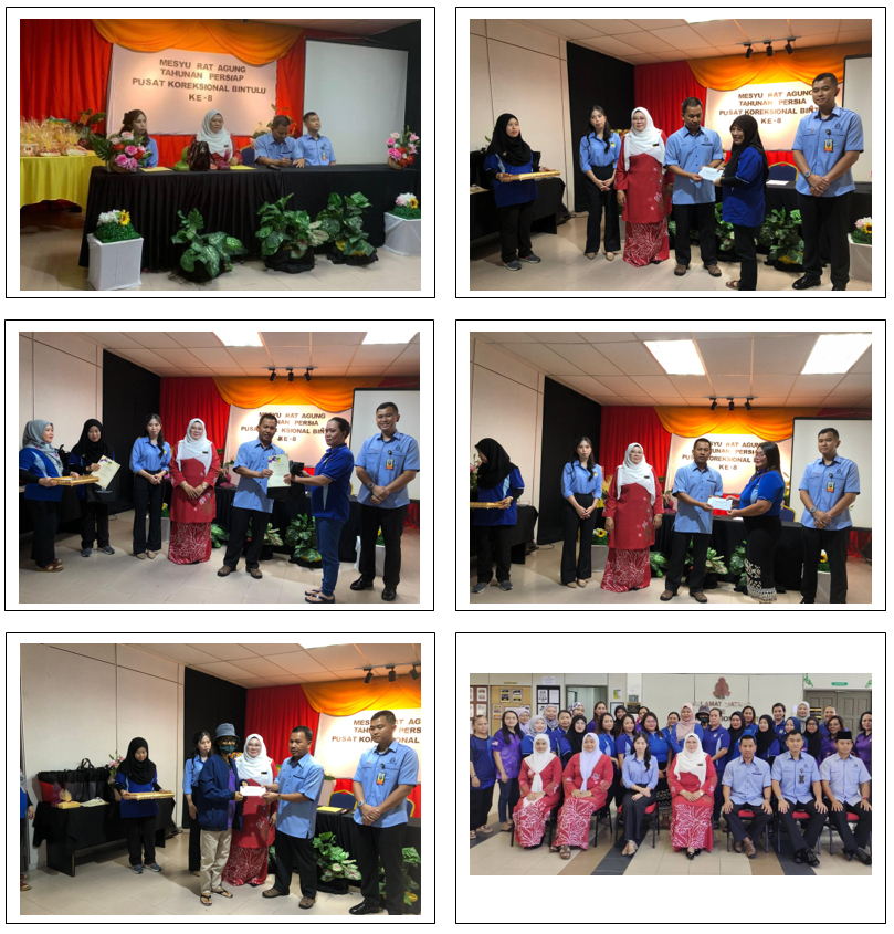 Pada 11 Mei 2024 (Sabtu), telah diadakan Mesyuarat Agung Tahunan PERSIAP Pusat Koreksional Bintulu/ PPK/ PPA Kali Ke-8. Seramai 35 orang ahli telah hadir pada mesyuarat tersebut. Perasmian mesyuarat telah disempurnakan oleh PKP Zakaria bin Mat Jusoh, Pengarah Pusat Koreksional Bintulu/ PPK/ PPA merangkap Penaung PERSIAP Pengarah Pusat Koreksional Bintulu/ PPK/ PPA. Mesyuarat edisi ke-8 ini telah membubarkan Jawatankuasa Cawangan Sesi 2022/2023 dan telah membuat pelantikan Ahli Jawatankuasa yang baharu bagi sesi 2024/2025. Selesai mesyuarat, telah diadakan sesi penyampaian sumbangan kebajikan kepada 3 orang ahli PERSIAP yang sedang menghidap penyakit kronik dan beberapa orang anak istimewa. Mesyuarat yang bermula pada jam 9.00 pagi ini telah berakhir pada jam 12.00 tengah hari.