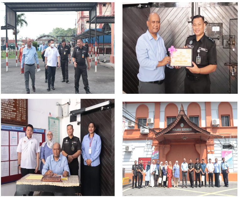 Pada 05 Jun 2024 (Rabu) - Penjara Seremban telah menerima Lawatan kerja daripada bahagian kewangan Kementerian Dalam Negeri (KDN) ke Penjara Seremban yang disambut oleh Pengarah Penjara Seremban PKP Sharil dan Basir dan PP Abd Aziz Bin Che Mamat Timbalan Pengarah Penjara Negeri Sembilan bersama pegawai-pegawai kanan. Aturcara dimulakan dengan persembahan daripada penghuni Penjara Seremban. Seterusnya, melawat ke bengkel- bengkel, blok penempatan, dapur dan klinik kesihatan Penjara untuk sesi tujuan sesi pengkongsian dan pendapat. Lawatan diakhiri dengan sesi bergambar dan penyampaian cenderahati kenangan daripada pihak Penjara Negeri Sembilan.