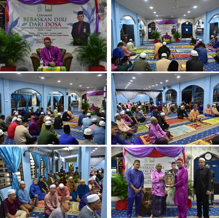 Ceramah Kemerdekaan 2024 "Bebaskan Diri Dari Dosa" Peringkat Kakitangan Penjara Taiping telah diadakan pada hari Khamis, 29 Ogos 2024 bersamaan 24 Safar 1446H di Surau Al-Hikmah, Kuarters Kakitangan Penjara Taiping. Antara pengisian program ialah ceramah berkaitan kemerdekaan hakiki yang disampaikan oleh YBhg. Al-Fadhil Ustaz Anuar Hakim bin Mohd Salleh, Timbalan Pengarah (Agama), Bahagian Agama dan Kaunseling, IPPM. Penyampaian Cenderahati disempurnakan oleh PKK Nazri bin Mohamad, Pengarah Penjara Taiping. Program bermula selepas Solat Maghrib dan berakhir jam 9.00 malam. Seramai 200 orang kakitangan dan keluarga terlibat dalam program ini.
