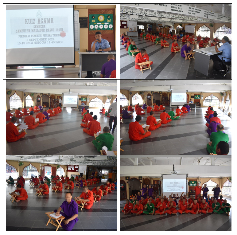 Kuiz Agama Sempena Sambutan Maulidur Rasul 1446H Peringkat Penghuni Penjara Taiping telah diadakan pada hari Rabu, 11 September 2024 di Surau Al-Hidayah Penjara Taiping. Pertandingan ini diadakan bagi menguji tahap pengetahuan para penghuni berkaitan penguasaan Fardhu ‘Ain dan Sirah Nabi Muhammad S.A.W. Pertandingan ini terbuka kepada semua penghuni beragama Islam. Hadiah kepada penghuni yang mendapat markah tertinggi akan disampaikan dalam Majlis Penutupan Sambutan Maulidur Rasul 1446H.