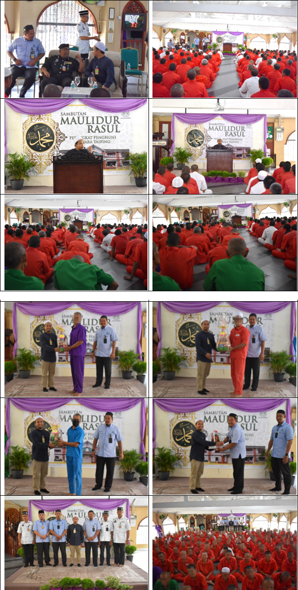 Majlis Penutupan Sambutan Maulidur Rasul 1446H Peringkat Penghuni Penjara Taiping telah diadakan pada hari Rabu, 16 Oktober 2024 di Surau Al-Hidayah Penjara Taiping. Antara pengisian program ialah Alunan Selawat dan Sesi Ceramah Maulidur Rasul yang disampaikan oleh YBhg. Al-Fadhil Ustaz Mohamad Idris Assyafie bin Mohd Zaki, Guru Agama, Madrasah At-Tazkiyyah Kampung Pinang, Perak. Majlis turut diserikan dengan penyampaian hadiah kepada penghuni yang terlibat dalam Pertandingan-pertandingan Ilmiah sempena Maulidur Rasul iaitu Pertandingan Tulisan Jawi, Kuiz Maulidur Rasul dan Pertandingan Nasyid Solo yang telah diadakan sepanjang Rabiul Awal 1446H. Program bermula jam 10.00 pagi dan berakhir jam 12.00 tengahari yang melibatkan seramai 200 orang penghuni.