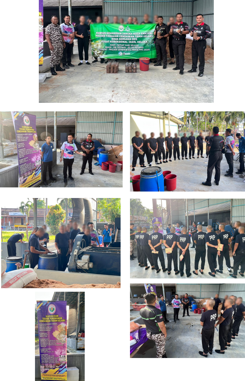 Pada 21 Januari 2025 (Selasa), Pusat Koreksional Jasin dan Pertubuhan Peladang Kawasan Jasin telah bekerjasama mengadakan Kursus Kemahiran Jangka Masa Panjang Projek Tanaman Cendawan Tiram Kelabu Khas kepada ODS, Pusat Koreksional Jasin, Melaka. Kursus ini bertujuan adalah untuk memberikan pendedahan dan peluang kepada ODS yang terlibat didalam proses penanaman dan penyediaan cendawan tiram secara efektif. Kursus ini telah diadakan di Projek Cendawan Tiram Pertubuhan Peladang Kawasan Jasin dan akan diadakan pada setiap hari Selasa sehingga 25 Mac 2025. Turut hadir semasa lawatan adalah TPP Razrin Hamidi bin Abdul Razak, Ketua Bahagian Korektif Pusat Koreksional Jasin dan TPP Asrul Effandi bin Abdullah ,Ketua Unit Keselamatan Pusat Koreksional Jasin. Turut hadir Encik Asna Nazifi bin Abd Aziz, Pengurus Projek Pertubuhan Peladang Kawasan Jasin. Pihak Pengurusan Pusat Koreksional Jasin merakamkan setinggi-tinggi penghargaan kepada semua anggota yang terlibat secara langsung atau tidak langsung dalam menjayakan kursus ini.