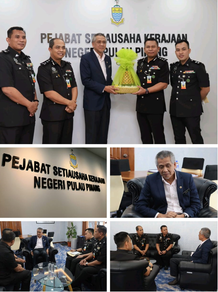 Pulau Pinang | 3 Februari 2025, YB Dato' Hj.Zulkifli bin Long, Setiausaha Kerajaan Negeri Pulau Pinang, telah berbesar hati menerima kunjungan hormat daripada PKK Abd. Rauf bin Lang Pasih, Pengarah Penjara Negeri Pulau Pinang. Tujuan utama kunjungan hormat ini dilakukan adalah untuk menzahirkan salam perkenalan dan bertukar-tukar idea serta pandangan berkaitan pengurusan kepenjaraan di Negeri Pulau Pinang. Selain itu, sesi kunjungan hormat juga membincangkan peranan kerajaan negeri dalam menyokong program-program Jabatan Penjara Malaysia khasnya pemulihan banduan dalam komuniti di peringkat Negeri Pulau Pinang. Turut hadir pada kunjungan hormat ini adalah PKK Mahadzair bin Che Daud, Pengarah Penjara Seberang Perai dan PP Zool Fadzli bin Ismail, Pengarah Penjara Reman Pulau Pinang. Kunjungan hormat ini diakhiri dengan majlis bertukar-tukar cenderahati.