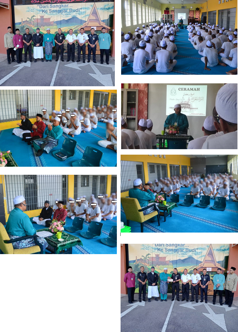 Majlis Sambutan Israk Mikraj, Nisfu Syaaban dan Ambang Ramadan bagi tahun 1446H / 2025M peringkat Orang DiSelia (ODS) Pusat Koreksional Jasin, Melaka telah berlangsung pada 21 Februari 2025 (Jumaat), bersamaan 22 Syaaban 1446H. Majlis telah diadakan di Surau Al-Hidayah, Pusat Koreksional Jasin, Melaka. Pengisian program adalah ceramah agama yang telah disampaikan oleh Al-Fadhil Tuan Haji Abd Manap bin Hj Mohamad, dari Jabatan Agama Islam Melaka. Seramai (150) Orang DiSelia (ODS) yang beragama Islam telah mengikuti program yang penuh bermakna ini. Turut serta dalam program ini, Pengarah Pusat Koreksional Jasin, PKP Shaharudin bin Ahmad, Timbalan Pengarah, PP Mohd Rehan bin Khamis, Ketua Bahagian Korektif, TPP Razrin Hamidi dan Ketua Bahagian Keselamatan, TPP Asrul Effandi, TPP Rafizi Ramli serta pegawai Unit Agama dan kakitangan Pusat Koreksional Jasin. Penyelaras program tersebut ialah Ustaz Abdul Lathif bin Ismail. Objektif program adalah untuk memperingati dan menanam semangat kecintaan kepada Nabi Muhammad SAW serta menyemai nilai-nilai murni kepada ODS dengan akhlak dan sunnah yang dibawa oleh baginda melalui peristiwa Isra’ Mikraj dan menghayati ibrah serta kelebihan bulan Syaaban dan Ramadan yang bakal kunjung tiba.