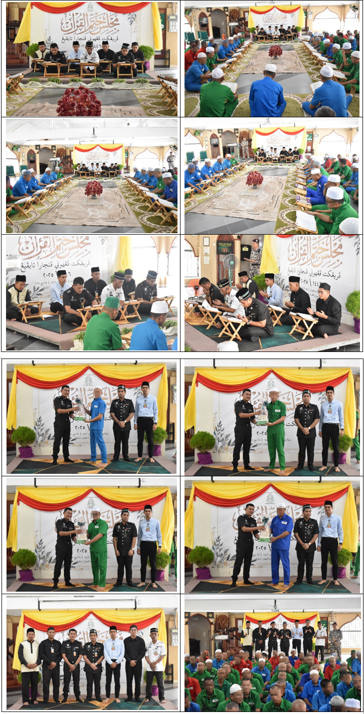 Majlis Khatam Al-Quran 1446H Peringkat Penghuni Penjara Taiping telah diadakan pada hari Khamis, 25 Mac 2025 bersamaan 24 Ramadan 1446H di Surau Al-Hidayah, Penjara Taiping. Majlis ini diadakan bertujuan meraikan penghuni-penghuni yang telah berjaya mengkhatamkan bacaan Al-Quran dalam Program Tadarus Al-Quran Ramadan 1446H. Majlis dimulakan dengan Bacaan Ayat-ayat Suci Al-Quran dan diakhiri Doa Khatam Al-Quran yang dipimpin oleh Al-Fadhil Ustaz Abdul Raqib bin Mohd Yusop. Majlis ini dihadiri oleh PP Shahrul Izzat bin Hamid, Timbalan Pengarah Penjara Taiping dan TPP Teuku Mohd Hasbi bin Tarmizi, Ketua Bahagian Pemulihan Penjara Taiping. Penyampaian hadiah dan sumbangan kepada para peserta tadarus telah disempurnakan oleh PP Shahrul Izzat bin Hamid. Majlis ini bermula jam 3.00 petang dan berakhir sekitar jam 4.15 petang dan disertai oleh 110 orang penghuni.