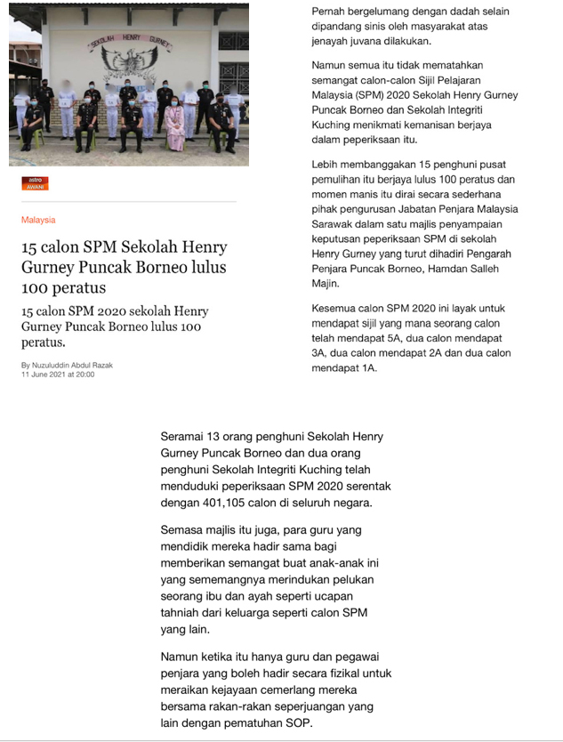 Keratan Akhbar : 15 Calon SPM Sekolah Henry Gurney Penjara Puncak Borneo Lulus 100 Peratus