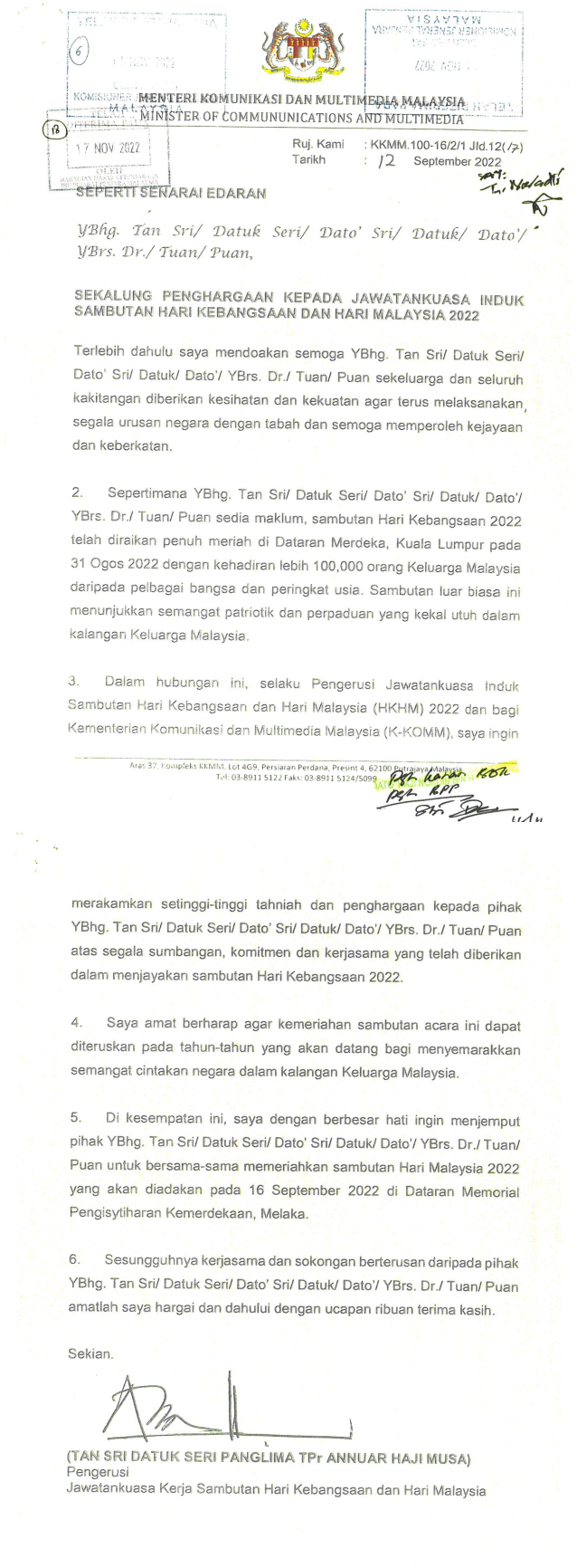 Sekalung Penghargaan Kepada Jawatankuada induk Sambutan Hari Kebangsaan Dan Hari Malaysia 2022