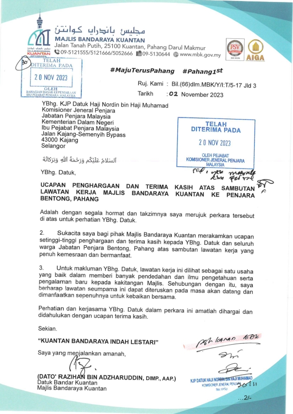 Ucapan Penghargaan Dan Terima Kasih Atas Sambutan Lawatan Kerja Majlis Bandaraya Kuantan Ke Penjara Bentong, Pahang